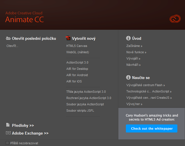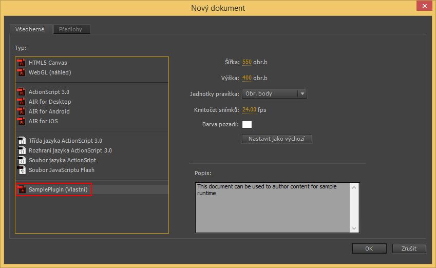 Po instalaci přidá zásuvný modul do aplikace Animate nový typ dokumentu. K tvorbě můžete použít sadu nástrojů, které zásuvný modul pro platformu aktivuje. Při publikování používá aplikace Animate nastavení nakonfigurovaná pro vlastní platformu.
