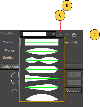Uložení profilu šířky je povoleno, pouze když je na ploše vybrána proměnlivá šířka mimo výchozí profily šířek. Pomocí nástroje Šířka můžete vytvářet svoje vlastní profily tahu a pak je ukládat. Obdobně se aktivuje ikona odstranění profilu šířky po výběru vlastního profilu tloušťky v rozbalovacím seznamu. Tuto možnost můžete použít, pokud chcete odstranit některý vlastní profil.