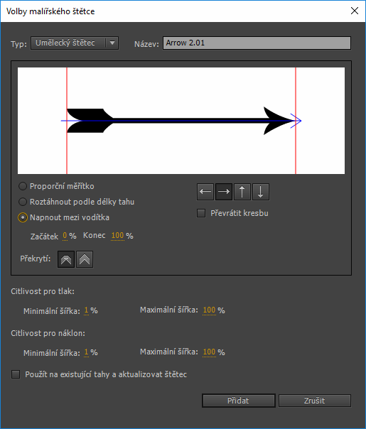 Ikona Upravit štětec spustí dialogové okno pro úpravy vybraného štětce. Pokud vyberete umělecký štětec pro úpravy, zobrazí se nové dialogové okno Možnosti uměleckého štětce. Můžete upravit vlastnosti, jako je směr štětce, předvolby měřítka a předvolby překrytí a tyto změny použít u existujících tahů.
