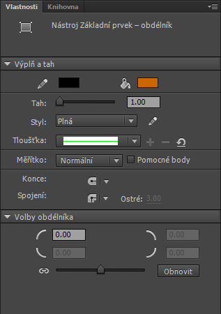 Tyto ovládací prvky inspektoru vlastností jsou specifické pro nástroj Základní prvek – obdélník.