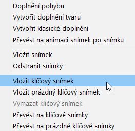 - Chcete-li vytvořit nový klíčový snímek, zvolte Vložit > Časová osa > Klíčový snímek (F6), případně pravým tlačítkem (Windows) nebo se současně stisknutou klávesou Ctrl (Macintosh) klikněte na snímek, na který chcete umístit klíčový snímek, a v místní nabídce vyberte Vložit klíčový snímek.