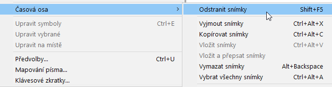 Vyberte snímek nebo sekvenci a zvolte Úpravy > Časová osa > Odstranit snímek, případně pravým tlačítkem (Windows) nebo se stisknutou klávesou Ctrl (Macintosh) klikněte na snímek nebo sekvenci a v místní nabídce vyberte možnost Odstranit snímek.