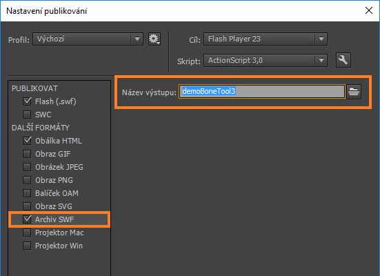 Vyberte dokument ActionScript a klikněte na Soubor > Nastavení publikování > Další formáty > Archiv SWF.