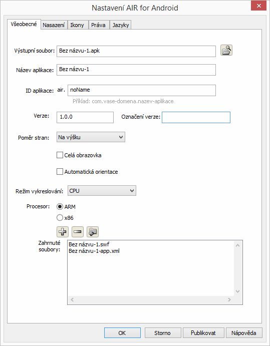 Doplňte údaje v dialogovém okně Prostředí AIR for Android – Nastavení aplikace a instalátoru a pak klepněte na tlačítko Publikovat. Po kliknutí na tlačítko Publikovat, budou sbaleny následující soubory: - Soubor SWF