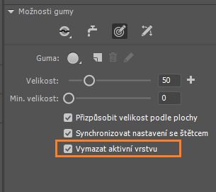 V nástroji Guma (E) zaškrtněte políčko Vymazat v aktivní vrstvě.