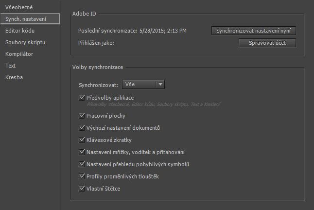 Zde se zobrazuje Adobe ID používané při přihlášení k účtu služby Creative Cloud a datum a čas poslední synchronizace s účtem služby Creative Cloud.