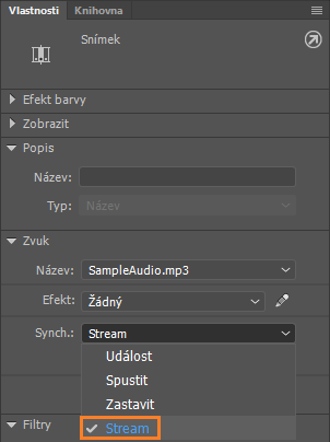 Synchronizace zvuku s animací se provádí spouštěním a zastavováním zvuku na klíčových snímcích.