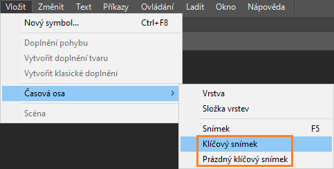 Klikněte na Vložit > Časová osa > Klíčový snímek nebo Vložit > Časová osa > Prázdný klíčový snímek.