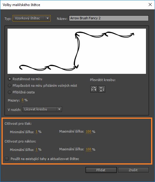- Roztáhnout podle délky tahu: Roztáhne štětec podle délky kresleného tahu.