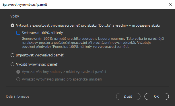 Chcete-li vytvořit vyrovnávací paměť pro vybranou složku a její podsložky, zvolte možnost Vytvořit a exportovat vyrovnávací paměť pro složku „název vybrané složky“ a všechny v ní obsažené složky. Tato volba je standardně vybraná.