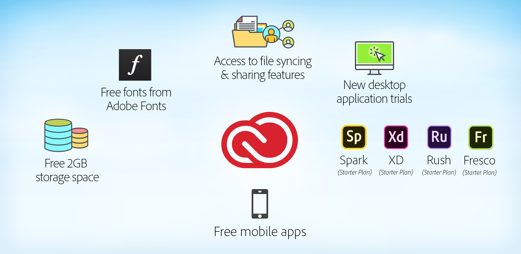 Adobe nabízí bezplatné členství ve službě Creative Cloud, které s sebou přináší řadu výhod. Pro přihlášení k bezplatnému členství ve službě Creative Cloud není nutný žádný nákup. Můžete si vytvořit Adobe ID a získat přístup k bezplatným verzím některých nejoblíbenějších aplikací a služeb společnosti Adobe. Tyto bezplatné verze aplikací a služeb Adobe vám umožní uvolnit vaši kreativitu a přejít na prémiové verze, které vám poskytnou lepší kreativní zážitky.