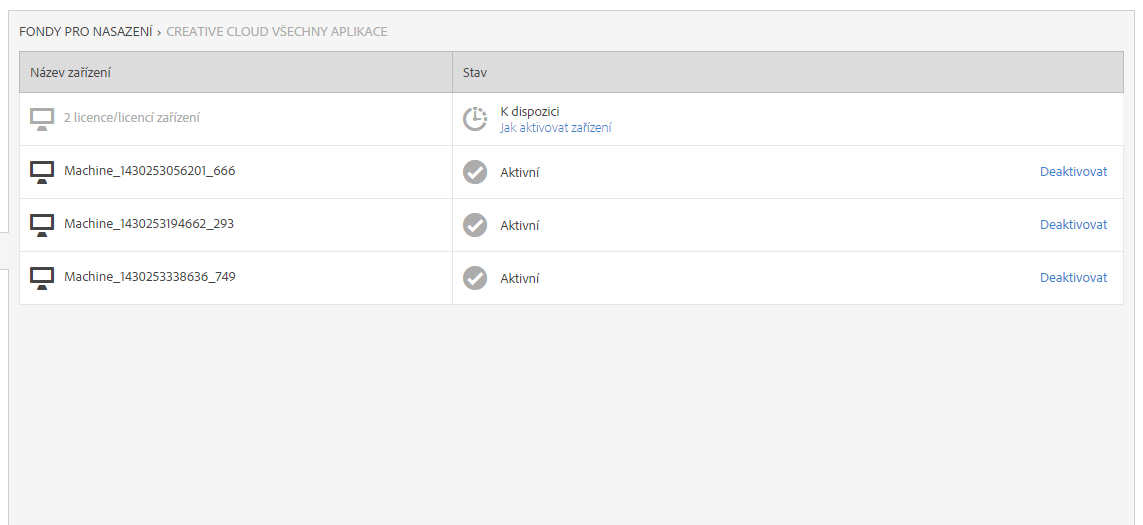 Když správce deaktivuje licenci v některém zařízení, v seznamu Deaktivovaná zařízení se zobrazí záznam zobrazující daný produkt, název zařízení a datum deaktivace licence. Pokud neexistují žádná deaktivovaná zařízení, tento seznam bude prázdný.