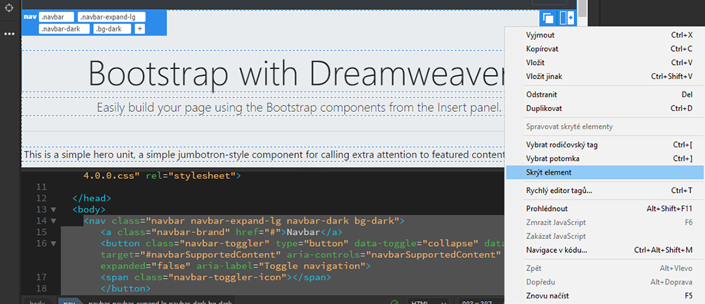 Pokud chcete skrýt element Bootstrap, klikněte pravým tlačítkem a vyberte možnost Skrýt element. Vybraný element tímto dočasně v zobrazení skryjete.