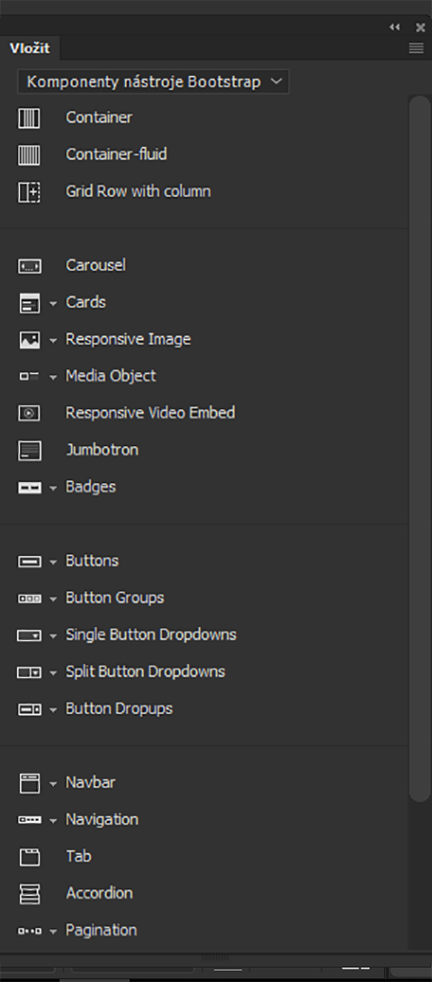 Možnost Komponenty Bootstrap na panelu Vložit uvádí všechny komponenty Bootstrap, které můžete v aplikaci Dreamweaver přidat do webové stránky. Podle verze Bootstrap uvedené v souboru bootstrap.css propojeném se stránkou ve formátu HTML jsou na panelu Vložit uvedeny odpovídající komponenty. Například ve verzi 4.0.0 jsou uvedeny některé komponenty navíc, třeba Karty nebo Symboly. Podobně jsou komponenty Glyphicons, Panel, Wells a Thumbnails dostupné pouze v Bootstrap v3.3.7. V závislosti na verzi Bootstrap uvidíte příslušné komponenty v panelu Vložit. Také komponenta symbolů probíhajících operací je k dispozici jen v nástroji Bootstrap verze 4.4.1.