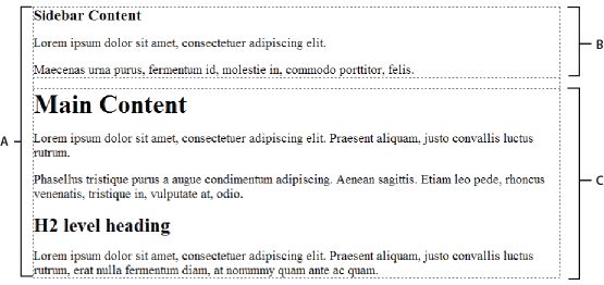 A. Div kontejneru B. Div bočního sloupce C. Div hlavního obsahu