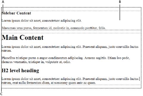 Předchozí ukázka kódu je zjednodušená verze, která vytvoří rozvržení se dvěma sloupci a pevným levým bočním panelem (pokud nový dokument vytvoříte pomocí předdefinovaných rozvržení dodávaných s aplikací Dreamweaver).