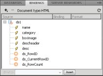 V panelu Svázání jsou také uvedeny některé vestavěné Spry elementy, ds_RowID, ds_CurrentRowID a ds_RowCount. Spry je používá k definování řádku, na který uživatel klikne, když určuje, čím aktualizovat dynamické oblasti podrobností.