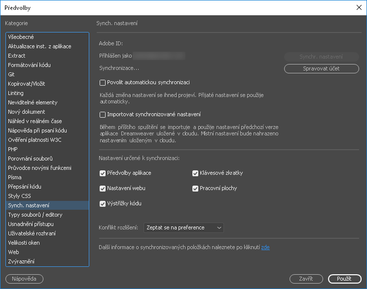 - Synchronizace nastavení aplikace Dreamweaver ve službě Creative Cloud