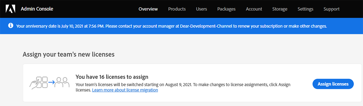 Bezproblémovou migraci členů týmu na předplatné Creative Cloud pro týmy Pro můžete provést pomocí intuitivního nástroje (průvodce) k přiřazování licencí v konzoli Adobe Admin Console. Chcete-li rychle migrovat uživatele do služby Creative Cloud pro týmy Pro, přejděte v konzoli Admin Console do sekce Přehled a klikněte na možnost Přiřadit licence.
