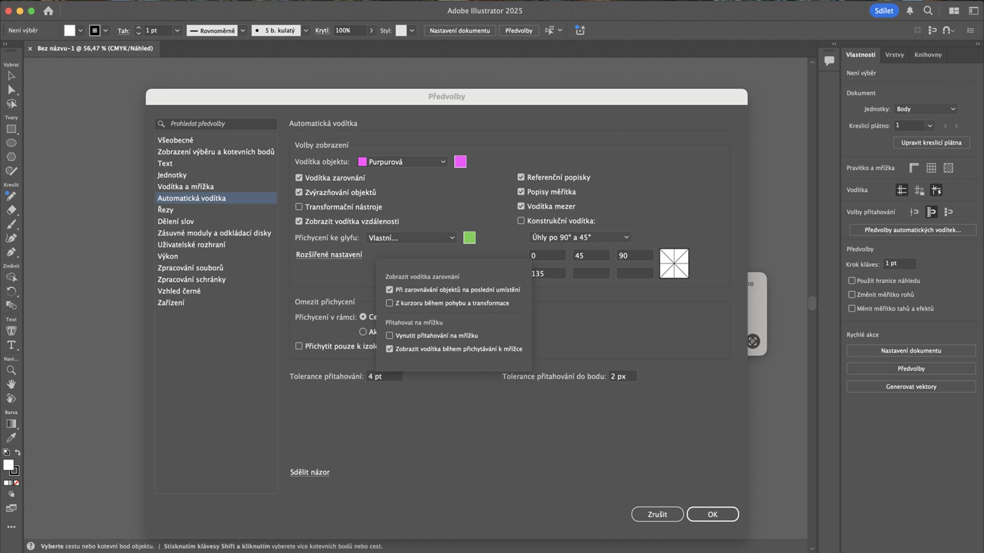 Rychle přepínejte mezi možnostmi Přitahovat na mřížku, Přichytit na pixely, Přitahovat do bodu a Automatická vodítka přímo z panelu rychlého přístupu pro přichycení pod ovládacím panelem. Použijte panel k okamžitému doladění předvoleb přichycení, jako jsou Vodítka zarovnání a Přichytit ke glyfu, pro plynulejší a přesnější zarovnání bez narušení vašeho pracovního postupu.