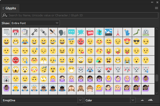 Glyfy v písmu Emoji, například písmu EmojiOne, se liší od písmen na vaší klávesnici. Tyto glyfy jsou považovány za jednotlivé znaky a jsou k dispozici pouze z panelu glyfů, nikoli z klávesnice.