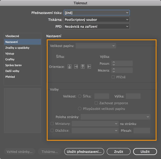 Při tisku dokumentu aplikace InDesign do postscriptového souboru nejsou možnosti pro přizpůsobení stránky aktivní.