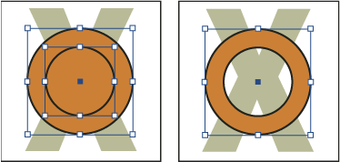 Pokud aplikujete výplň na složenou cestu, díry se někdy nezobrazí v místech, kde byste je očekávali. U jednoduché cesty, například obdélníku, je vnitřek nebo oblast, kterou můžete vyplnit, snadno vidět – je to oblast uvnitř uzavřené cesty. U složené cesty ale musí InDesign rozhodnout, zda průsečíky vytvořené dílčí cestou složené cesty jsou uvnitř (vyplněné plochy) nebo vně (díry). Směr každé dílčí cesty – pořadí, ve kterém byly vytvořeny její body – určuje, zda oblast, kterou definuje, leží uvnitř nebo vně. Pokud je vyplněna dílčí cesta a chcete, aby představovala otvor (nebo naopak), kliknutím na možnost Obrátit cestu na panelu Cestář obraťte směr dílčí cesty.