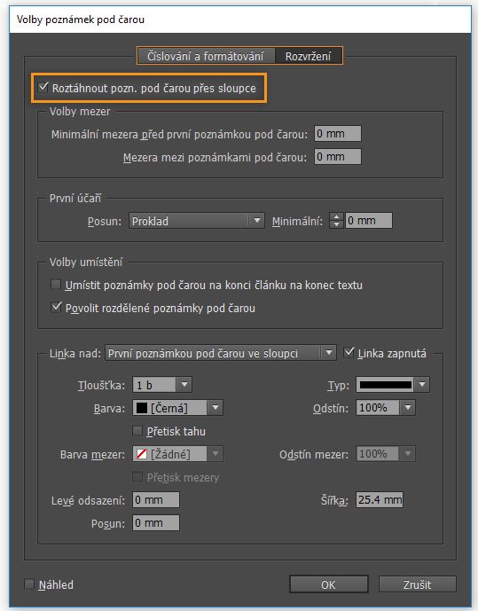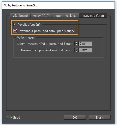 Roztáhnout poznámku pod čarou přes všechny sloupce textového rámečku