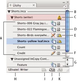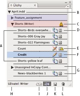A. Názvy obsahu InCopy B. Název dokumentu aplikace InDesign C. Stav úlohy Neaktuální D. Stav Upravovaný a aktuální text E. Stav Používaný a neaktuální textový obsah F. Stav Upravovaný a aktuální textový obsah G. Nepřiřazený obsah H. Jméno uživatele I. Tlačítko Aktualizovat obsah J. Tlačítko Vyhradit si/Zpřístupnit výběr K. Tlačítko Nová úloha L. Tlačítko Odstranit vybrané úlohy/Odstranit