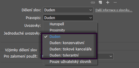 Vyberte možnost Upravit > Předvolby > Kontrola pravopisu (Windows) nebo InDesign > Předvolby > Kontrola pravopisu (macOS).