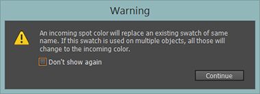 Pokud nyní importujete soubory s kanálem přímých barev, který má stejný název jako přímá barva v dokumentu, zobrazí se následující varování: