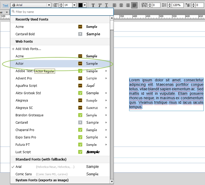 Se stále vybraným textem vyberte písmo Typekit, které chcete použít, v nabídce Písmo.