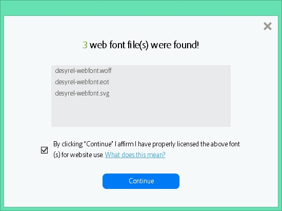 Aplikace Adobe Muse vyhledá v zadané složce soubory webových písem a automaticky je přiřadí k odpovídajícímu systémovému písmu. Potvrďte, že máte platnou licenci pro toto webové písmo a klikněte na tlačítko Pokračovat.