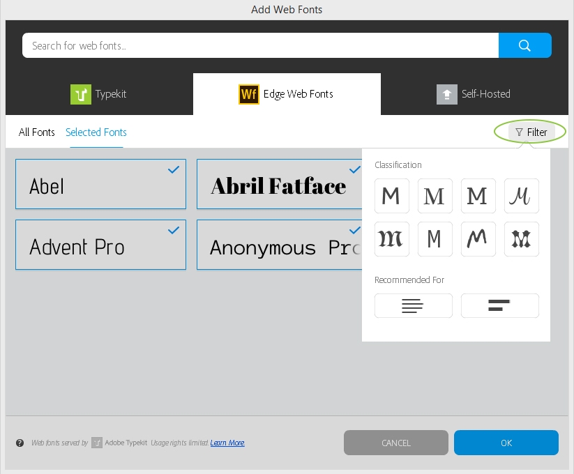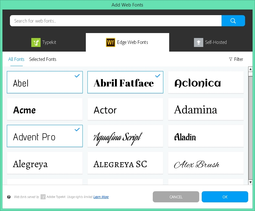 Pokud jste již někdy přidali webová písma s vlastním hostitelem, zapne se v zobrazeném dialogu Přidat webová písma automaticky režim procházení. Tento režim nabízí náhledy miniatur písem (seskupené podle rodin), které můžete vybráním přidávat do rozbalovacího seznamu Písma. (Pokud nenastanou nějaké problémy, například chybí soubory písma nebo neexistuje žádné odpovídající písmo v počítači, jsou ve výchozím nastavení všechna nově přidaná webová písma s vlastním hostitelem přidávána do rozbalovacího seznamu Písma.) Můžete také filtrovat rodiny písem podle názvů nebo zobrazit pouze vybrané položky.