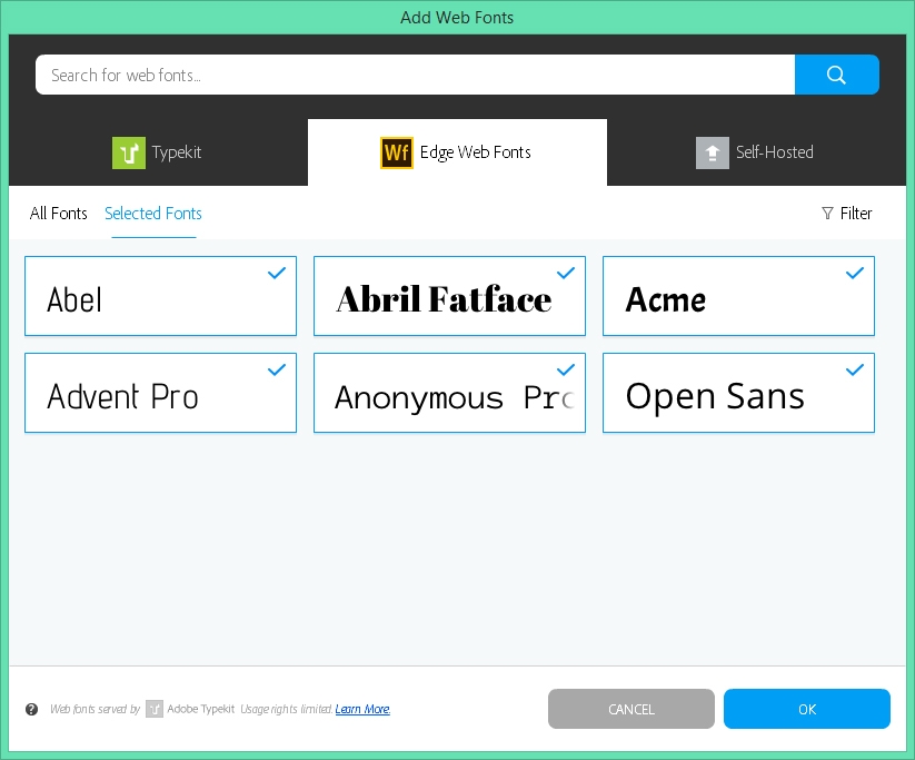 V dialogovém okně Přidat webová písma uvede karta Typekit všechna webová písma Typekit dostupná pro váš typ účtu služby Creative Cloud.