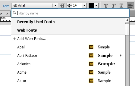 Pomocí nabídky písem (na panelu Řídící nebo Text) vyberte položky Webová písma > Přidat webová písma...