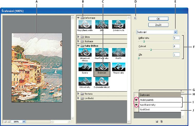 A. Náhled B. Kategorie filtrů C. Miniatura vybraného filtru D. Zobrazit/skrýt miniatury filtrů E. Rozbalovací nabídka filtrů F. Volby pro vybraný filtr G. Seznam efektů filtrů, které se mají aplikovat nebo uspořádat H. Efekt filtru je vybraný, ale není aplikovaný I. Efekty filtru se aplikují souhrnně, ale nejsou vybrané J. Skrytý efekt filtru