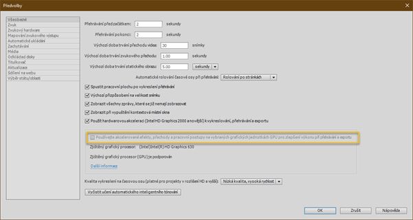 Otevřete možnost Předvolby > Obecné. Zrušte zaškrtnutí možnosti pro použití efektů, přechodů a pracovních postupů s akcelerací GPU u vybraných GPU, aby se zlepšil výkon při přehrávání a exportu. Zavřete a znovu spusťte aplikaci PRE. Nyní příslušný projekt znovu otevřete v aplikaci Premiere Elements 2021.
