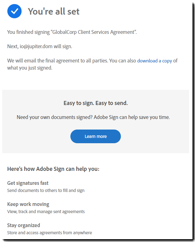 \n Pro integrované pracovní postupy OEM 2.0 nyní aplikace Acrobat Sign zobrazuje personalizovanou e-mailovou adresu uživatele namísto e-mailu registrovaného partnerem napříč klíčovými plochami uživatelského rozhraní a oznámeními. Smlouvy, fronty jako „Čeká na vás" a e-maily „Zkontrolovat a podepsat" konzistentně odrážejí personalizovanou identitu při zachování registrovaného e-mailu interně pro ověřování a oprávnění. To zlepšuje jasnost pro odesílatele a podepisující a zabraňuje odesílání e-mailů na nedoručitelné registrované adresy.