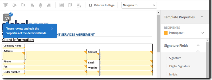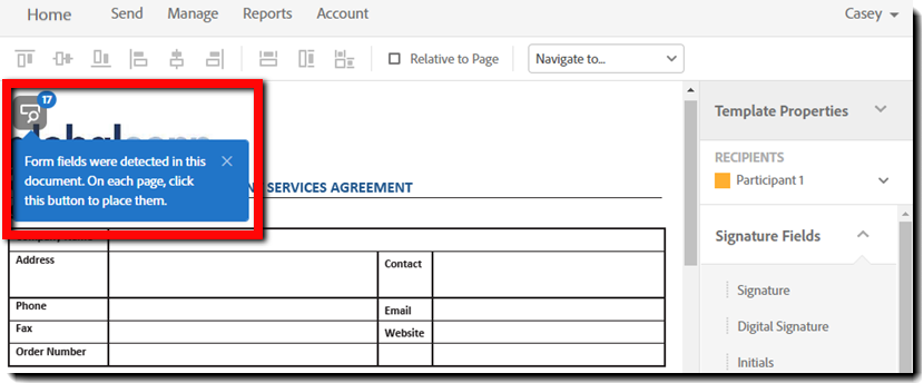 Při odesílání nového formuláře do prostředí pro vytváření aplikace Adobe Acrobat Sign automaticky vyhodnotí dokument a umístí kandidátská pole tam, kde orientační body na stránce naznačují, že budou pravděpodobně potřeba pole.