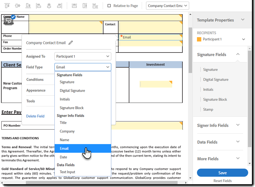 Služba Acrobat Sign také neví, kterému účastníkovi má být pole přiřazeno. Ve výchozím nastavení jsou všechna pole přiřazena „Účastníkovi 1“.