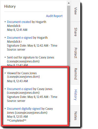Karta Historie a související Zpráva o auditu se od standardní zprávy o elektronickém podpisu mírně liší v tom, že obsahují jednu další událost: Dokument byl digitálně podepsán
