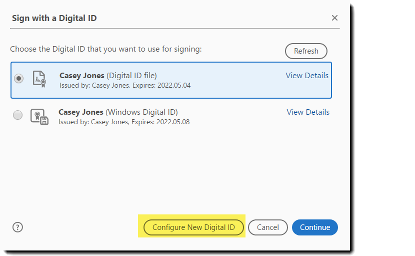 Vyberte možnost Vytvořit nové digitální ID a poté klikněte na možnost Pokračovat
