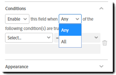 U jednoho pole lze nastavit více spouštěčů, a umožnit tak možnosti Jakékoli nebo Vše pro danou Podmínku. Jakmile je na místě jedna podmínka, přidá se další prázdná podmínka.