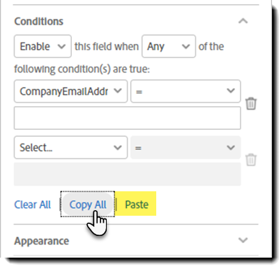 Po zkopírování podmínek se u všech polí, která podmínky podporují, zobrazí tlačítko Vložit. Nejsou-li u pole nastaveny žádné podmínky, vloží se do něj všechny podmínky.