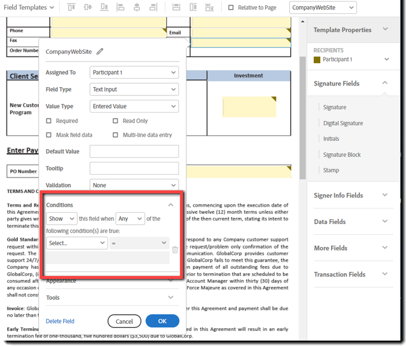 Podmínka umožňuje Zobrazit nebo Skrýt dané pole, pokud jsou splněny hodnoty podmínky. Tato podmínka může být jednotlivou akcí (například zaškrtnutí jedno políčka). Nebo může jít o řetězec událostí, které se (případně) musí stát, aby byla podmínka splněna. (Například zaškrtnutí políčka, přidání podpisu a výběr konkrétního přepínacího tlačítka.)