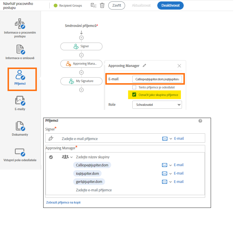 - Skupinu příjemců nelze odebrat z toku podpisů, i když příjemce není označen jako povinný.