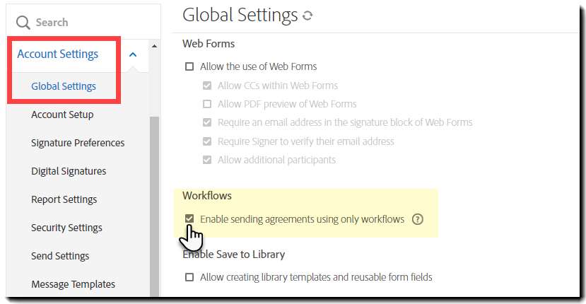 Pokud chcete uživatelům umožnit odesílání smluv pouze pomocí schválených pracovních postupů, přejděte na položku Globální nastavení > Vlastní pracovní postupy odeslání > Povolit odesílání dohod pouze pomocí pracovních postupů.