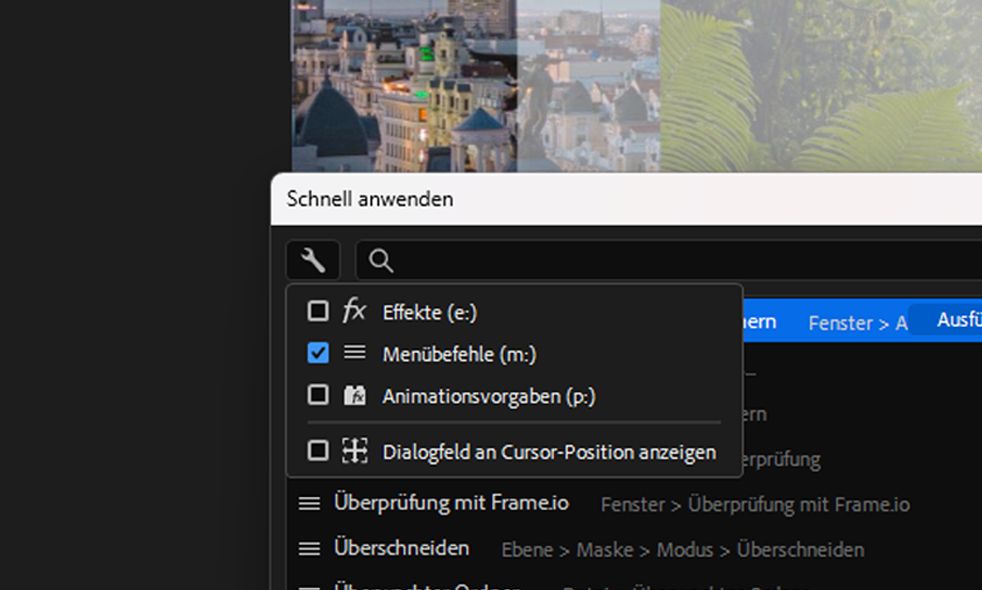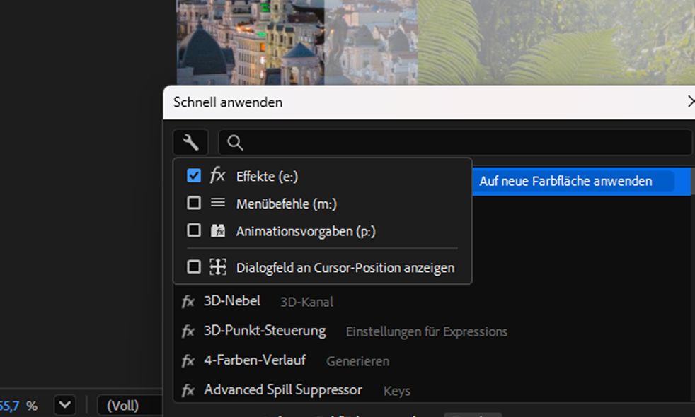 Verwende e:, um Effekte wie Unmult oder Unscharf maskieren zu filtern und schnell zu finden. Verwende e:, um Effekte wie Unmult oder Unscharf maskieren zu filtern und schnell zu finden. Tipp:Du kannst die Option Am Mauszeiger anzeigen aktivieren, wenn das Dialogfeld Schnell anwenden neben deiner Maus erscheinen soll. Wenn diese Option nicht aktiviert ist, öffnet sich das Dialogfeld an der zuletzt verwendeten Position.