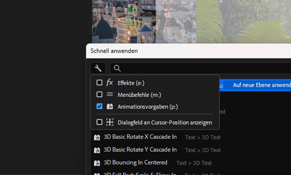 Erfahre, wie du Quick Apply verwendest, um nach Effekten, Animationsvoreinstellungen oder Menübefehlen in After Effects zu suchen und sie sofort anzuwenden.